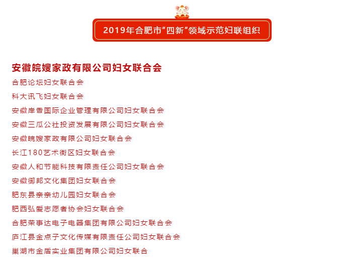 為皖嫂家政婦聯(lián)點(diǎn)贊!2019年初啟動(dòng)“四新”領(lǐng)域婦聯(lián)組織建設(shè)“雙十”行動(dòng)即在全市大力新建“四新”領(lǐng)域婦聯(lián)組織的基礎(chǔ)上培樹10個(gè)市級(jí)示范帶動(dòng)的“四新”婦聯(lián)組織各縣(市、區(qū))各培樹10個(gè)示范帶動(dòng)的“四新”婦聯(lián)組織。