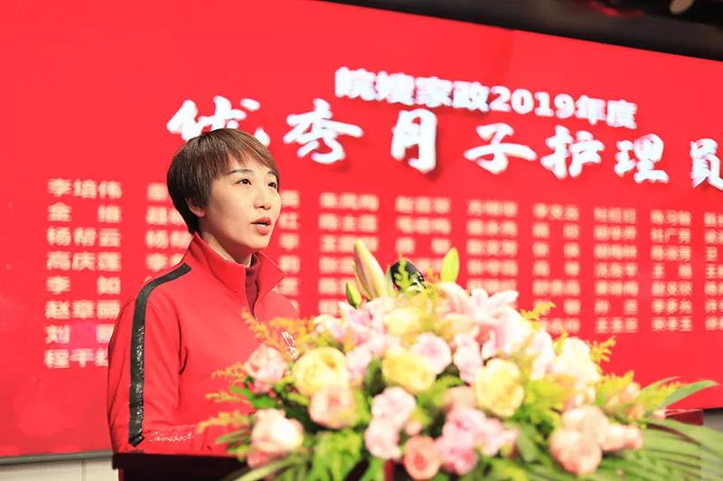 優秀月子護理員代表馬莉在臺上發言,在皖嫂這個平臺,她獲得了很多學習培訓的機會,同時也獲得了很多客戶的好評;在接下來的工作中,一定會盡心盡責,做好自己的工作,并將這份愛與責任回饋到社會中去。