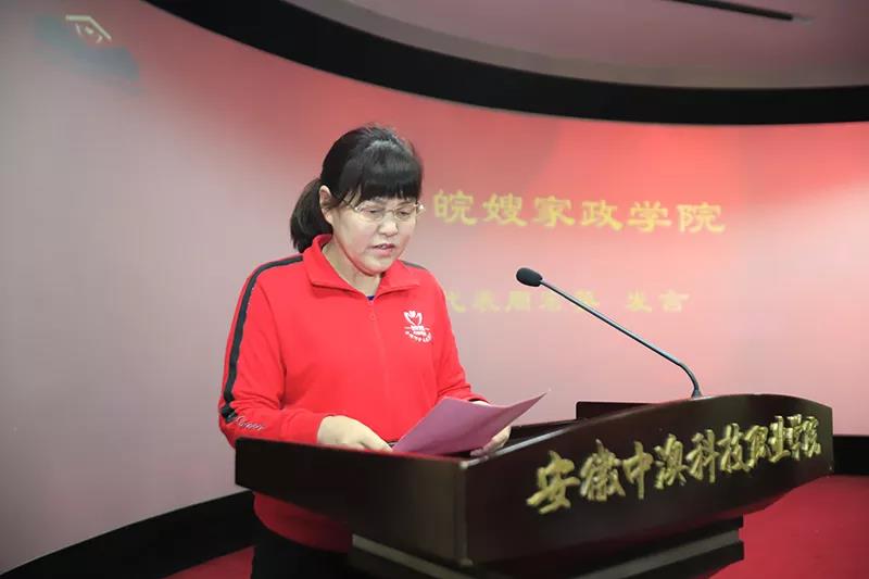 安徽省皖嫂家政公司董事長丁筱梅在發(fā)言中提到了皖嫂的發(fā)展歷程,并就中澳皖嫂家政學院成立的重大意義給予了高度評價,借此機會,她希望中澳皖嫂家政學院的全體學生,珍惜此次學習機會,扎實學習專業(yè)本領,發(fā)揮自己所長,歷練成為一名優(yōu)秀的家政服務人才。