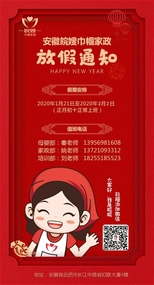 8、春節假期無疑是家政服務人員自我提升的好時機,在此我們呼吁廣大中澳皖嫂學員們,在家期間多多利用線上平臺學習新知識,提升自我!最后,請全體新老客戶、家政從業人員及公司職員注意安全,保證充足的睡眠和良好的飲食習慣,公司將根據政府發布的通告適時作出調整!