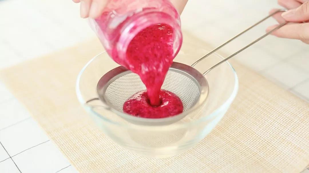 2、將切塊后的火龍果用湯匙碾壓成泥,用篩網過濾取汁。