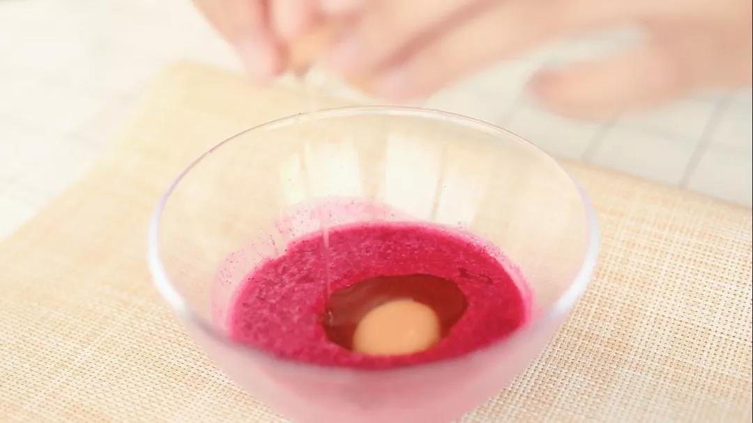 3、碗中磕入雞蛋,倒入火龍果汁一起攪拌均勻。