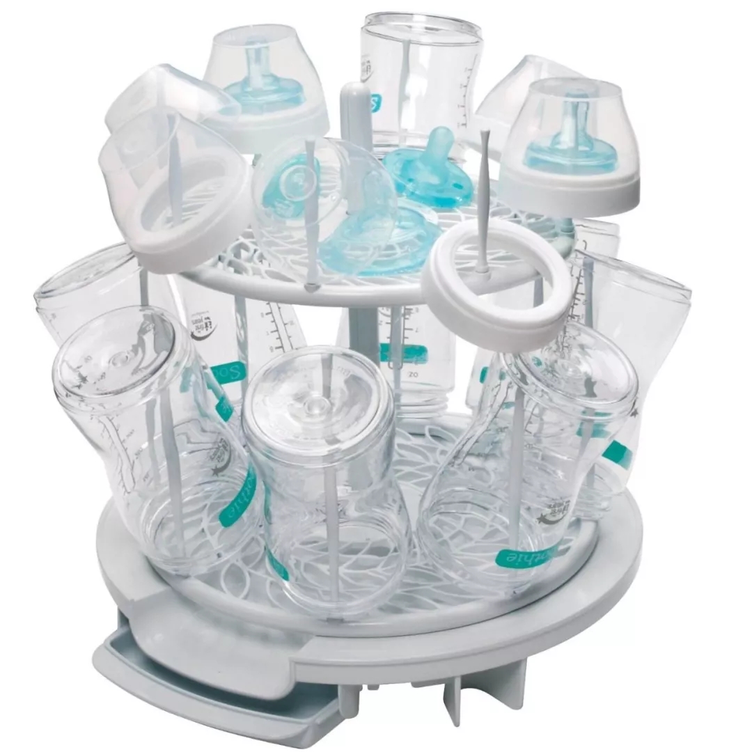 很多家庭會準備奶瓶架、瀝水架一類的晾曬工具,家長可以將清洗干凈的寶寶餐具倒扣在上面瀝水晾干。但很多家長會忽略了一點,就是寶寶的晾曬工具要專用,不要將大人的水杯、餐具跟寶寶奶瓶、餐具放一起晾曬,避免交叉污染。