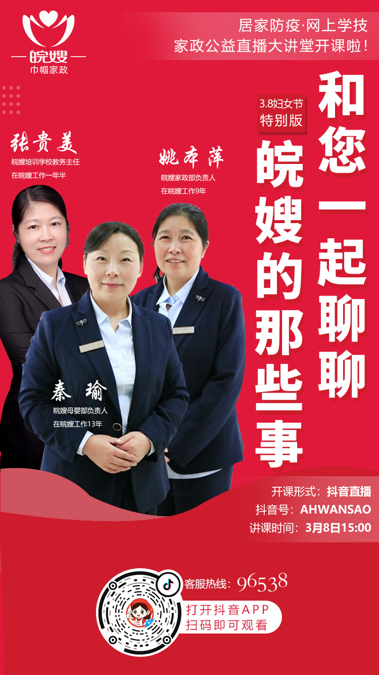 在2020年的這場疫情阻擊戰中,女性頂起了半邊天。為了迎接這個特殊的三八婦女節,皖嫂作為一家由省婦聯創辦的家政公司,在這個特殊的節日里,皖嫂啟動線上38婦女節,在皖嫂家政公益直播大講堂的直播間與大家一起來聊聊皖嫂家政的那些事!