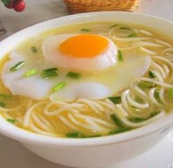材料:雞蛋兩個(gè),雞精1g,鹽3g,香油5g,掛面300g