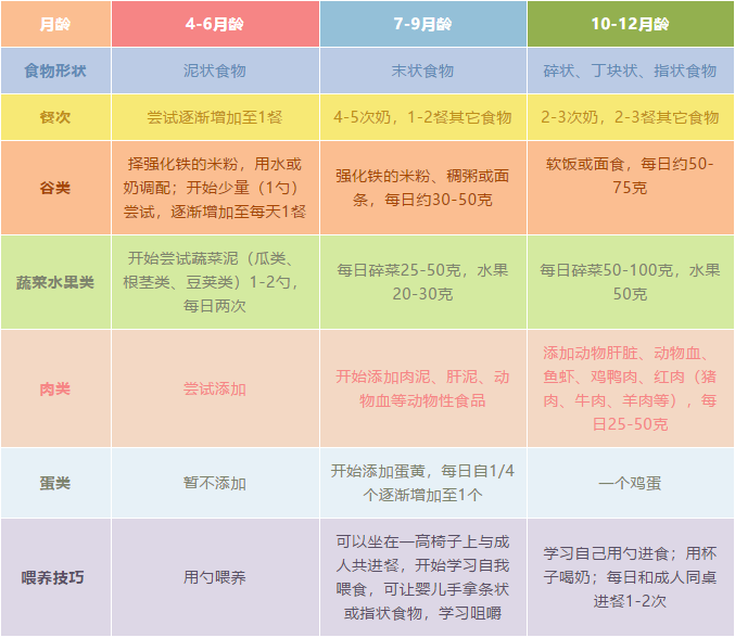 具體的添加順序,可以參考以下4-12個月寶寶輔食添加一覽表。