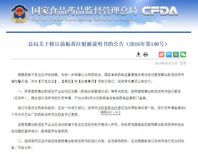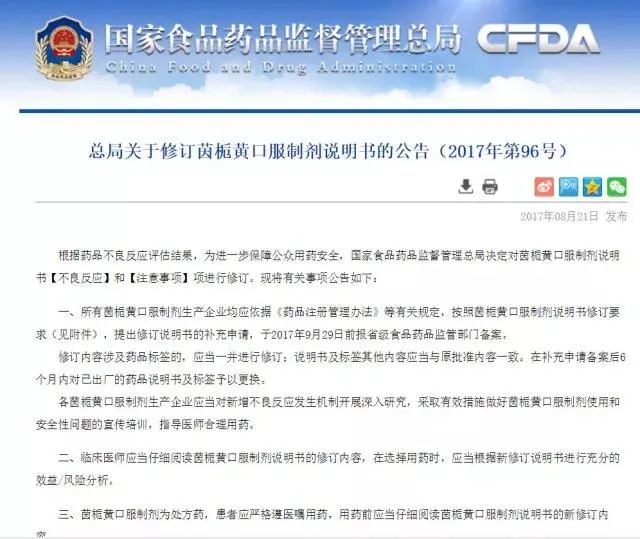 茵梔黃本身是中成藥,成分不明確,毒副作用很難評估。注射了茵梔黃之后,容易引起胃腸道出血、腎功能異常的不良反應。其中含有金銀花提取物,更是容易引發新生兒溶血。不少媽媽會問,國家禁止的是注射液,那茵梔黃的口服制劑是不是還是可以用的?17 年 CFDA 重新發布了修訂茵梔黃口服制劑說明書的公告,其中明確強調了口服茵梔后會出現腹瀉、嘔吐和皮疹等不良反應。