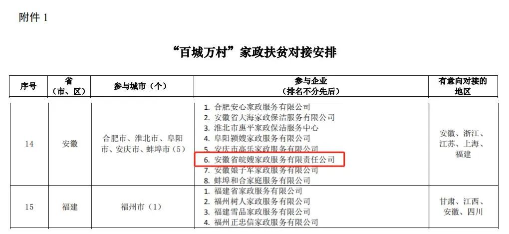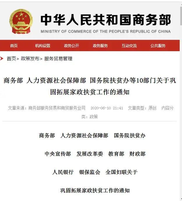 6月10日,國家商務部發布了《商務部人力資源社會保障部國務院扶貧辦等10部門關于鞏固拓展家政扶貧工作的通知》,并作出了“百城萬村”家政扶貧對接安排。