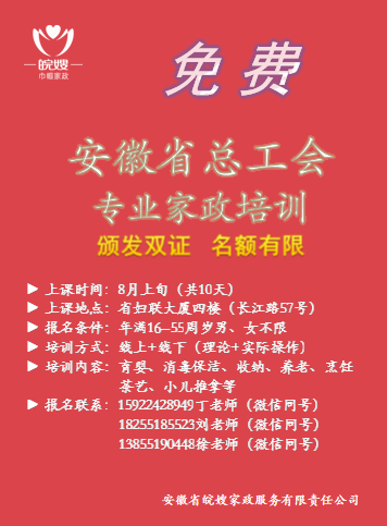 第二期“安徽省總工會(huì)家政免費(fèi)培訓(xùn)”將于八月開(kāi)課,快來(lái)報(bào)名吧!