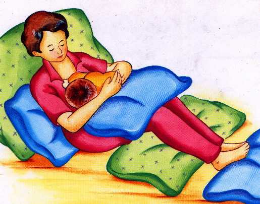 在分娩后的頭幾天,媽媽坐起來仍有困難,這時,以半躺式的姿勢喂哺寶寶便最為適合。把寶寶橫倚著媽媽的腹部,背后用枕頭墊高上身,斜靠躺臥。