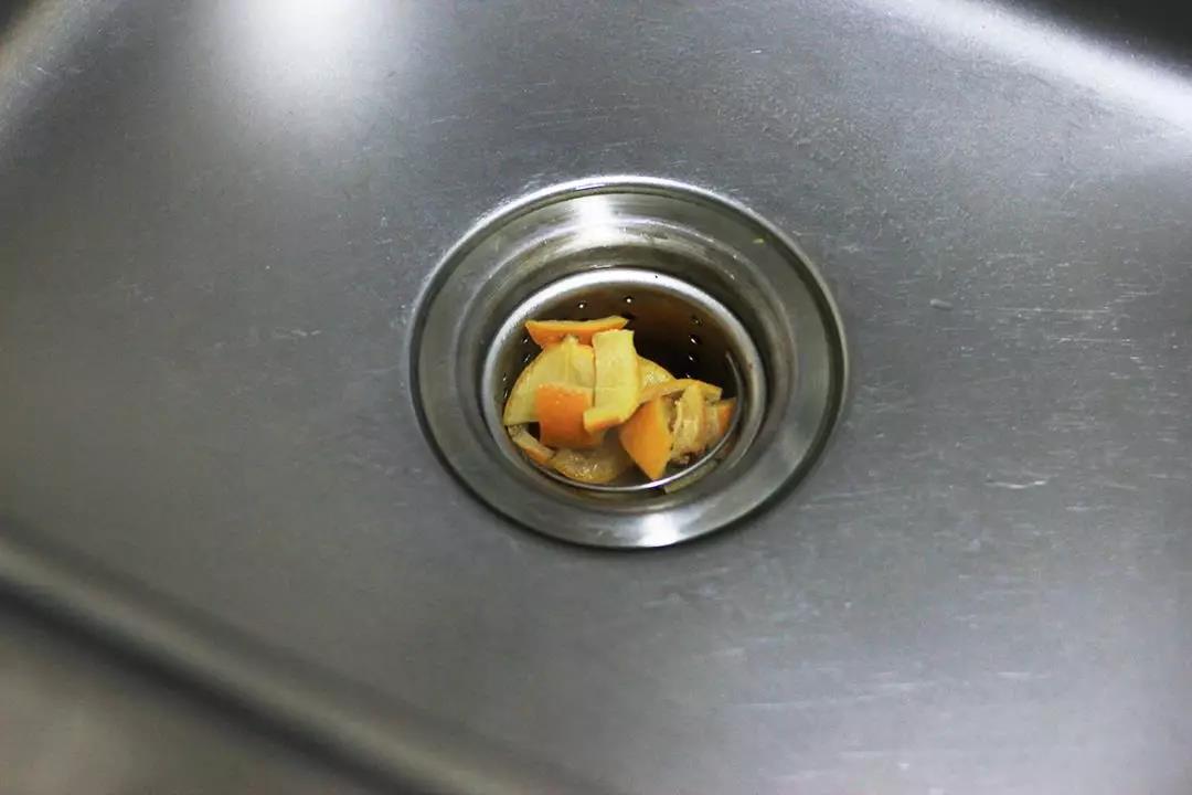 ③收集柑橘類果皮(風干后亦可),將其切成小塊后,與清水同煮至沸騰數分鐘后撈出,將沸水倒入下水道即可。