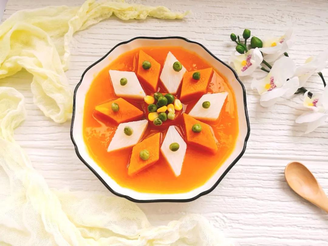 食材:南瓜 500克、山藥 450克、水淀粉 10克、玉米粒幾粒