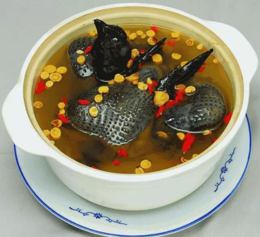 4.將海參、雞放在湯碗內,將筍花片放在海參與童子雞間的空隙兩頭,火腿片放在中央,加入精鹽、蔥、姜、雞骨、小排骨、高湯,蓋上蓋子,上籠蒸爛取出,除去雞骨、小排骨,撈去蔥姜即可食用。