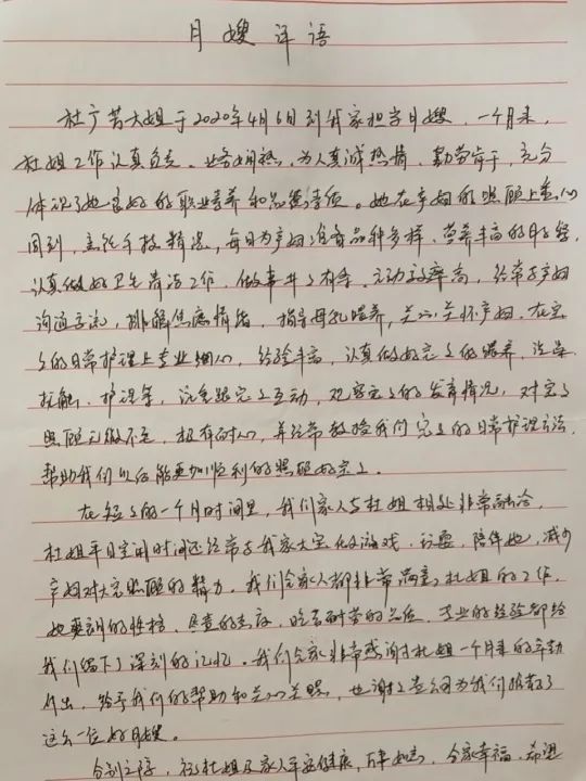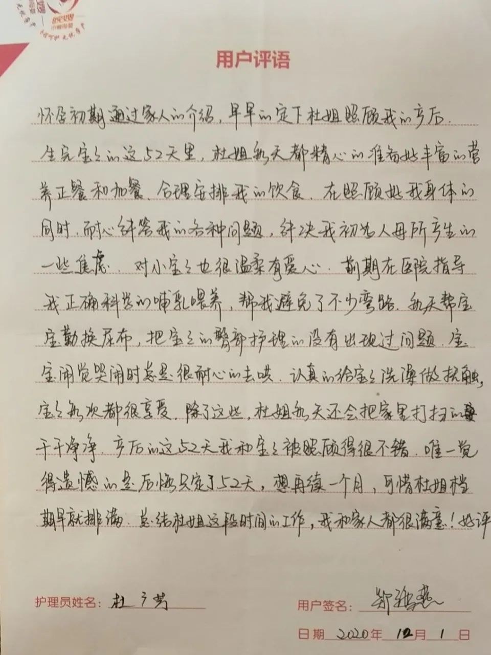 杜姐工作非常認真負責(zé),專業(yè)度很高,在寶寶出現(xiàn)異常,如尿布疹、濕疹等問題時,能及時發(fā)現(xiàn)并處理,而且性格溫和,在這42天里和全家都相處愉快,讓我輕松的做完了月子,也保證了寶寶的健康......