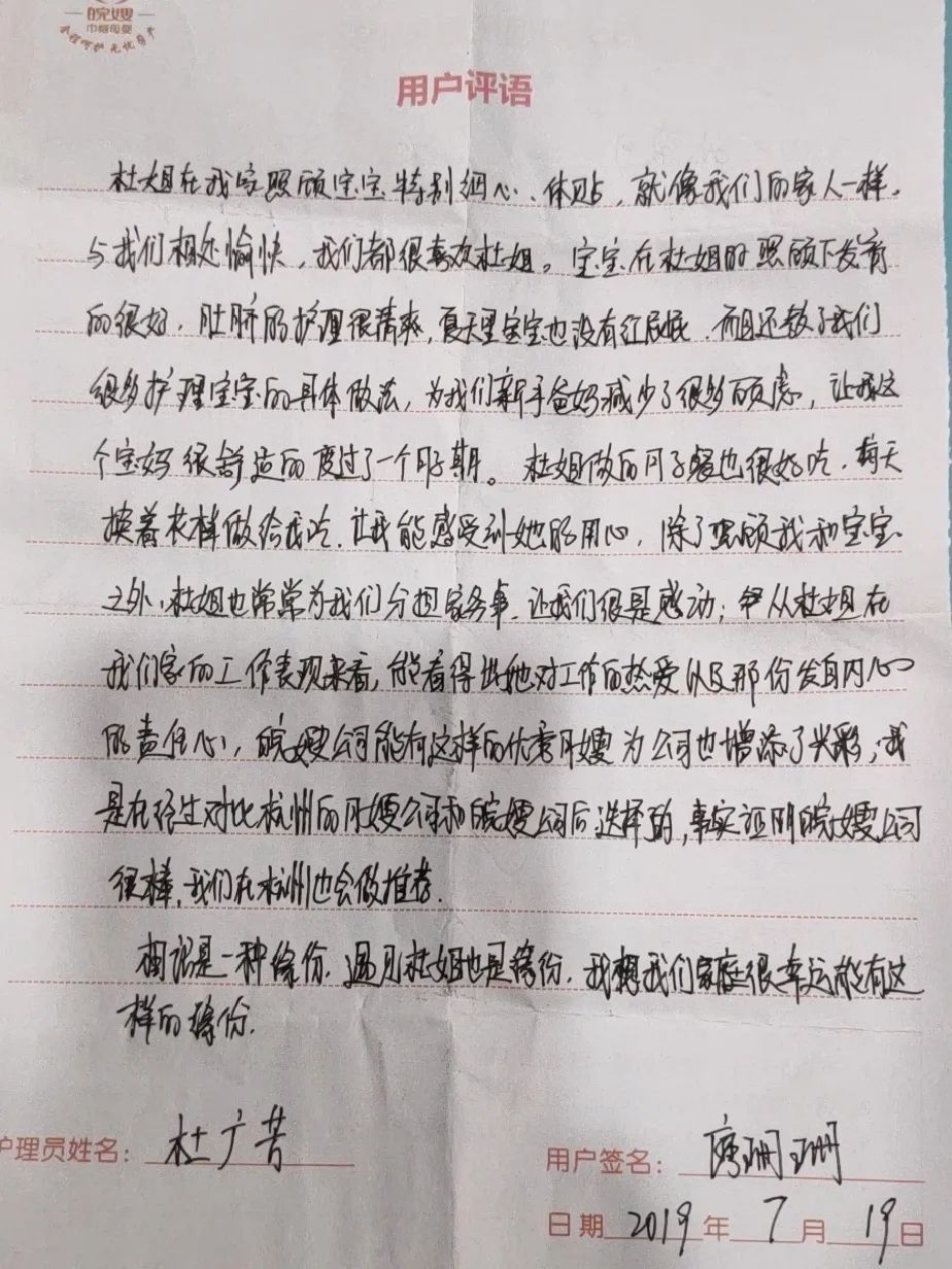 杜廣芳月嫂從事月子護理工作8年來,對產(chǎn)婦和新生兒的護理工作認真負責(zé),技術(shù)嫻熟,做事情能做到安排合理,井井有條,勤勞能干且高效。在用戶家服務(wù)對她都非常滿意,感受到她的專業(yè)與熱情!都積極推薦給身邊的親戚朋友,同學(xué)同事們,為公司贏得了好的口碑。