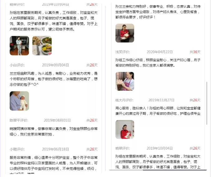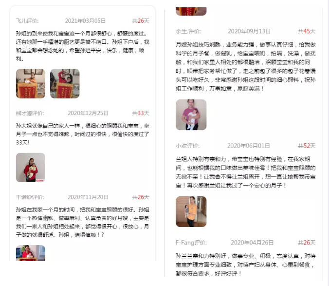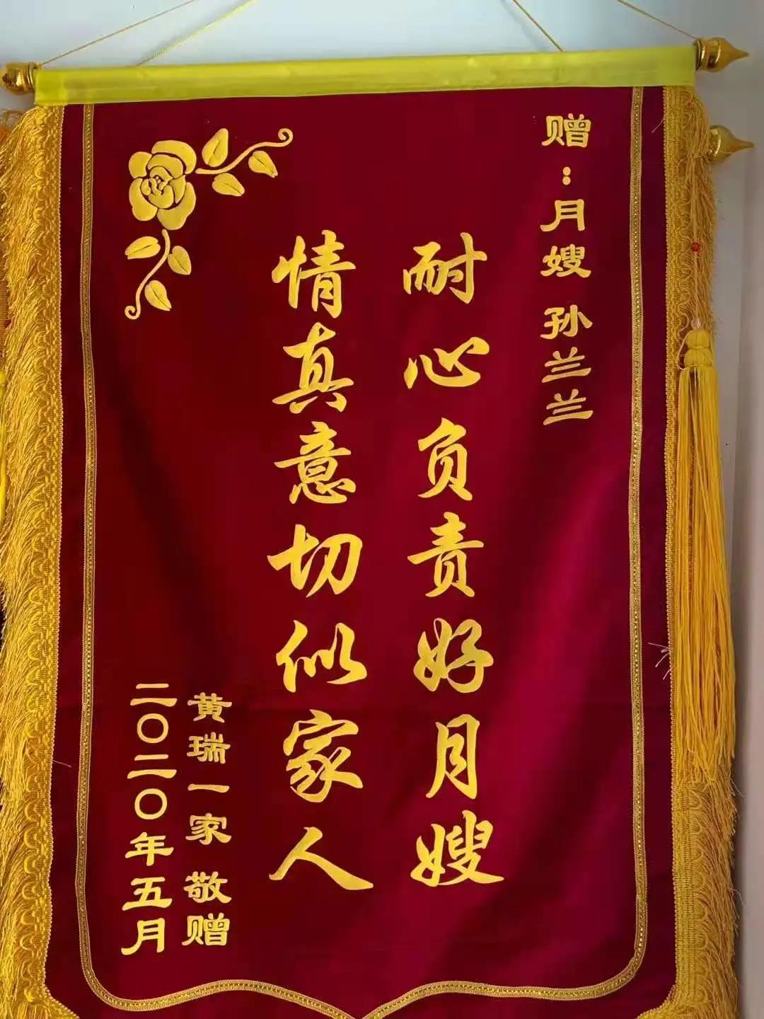 孫姐從事月嫂工作以來一直盡心盡責,跟客戶家庭相處如家人一般,工作兩年多以來得到很多客戶認可,受贈十多幅錦旗,客戶夸贊“耐心負責好月嫂,情真意切似家人”。在服務期間,積極主動地幫助寶媽解決月子期間各種問題,教會寶媽們很多育兒知識和技能,以便在孫姐結束服務之后,寶爸寶媽們可以更好的獨自照顧寶寶和自己。一九年至今,孫姐依然保持著0客訴0退單0差評得“三零服務”。