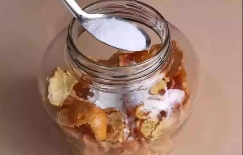 然后將橘子皮全部倒入容器中,再根據橘子皮的量加入適量的小蘇打,并加水至沒過橘子皮,用干凈的筷子將其攪拌均勻,是小蘇打完全溶于水中!