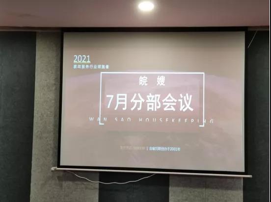 會議于11日下午17:30正式開始。皖嫂的快速發展,離不開新生血液的加入。會議的第一個環節是新同事自我介紹;隨后,皖嫂家政經開、望湖、濱湖、肥西、婦幼、高新、政務、南七、招商等負責人依序上臺匯報。通過對7月份工作進行回顧、分析、總結,找到自身的經驗及不足,并提出相應改進辦法,同時各分店也就7月份在工作中的創新舉措及取得的成績進行了經驗分享。