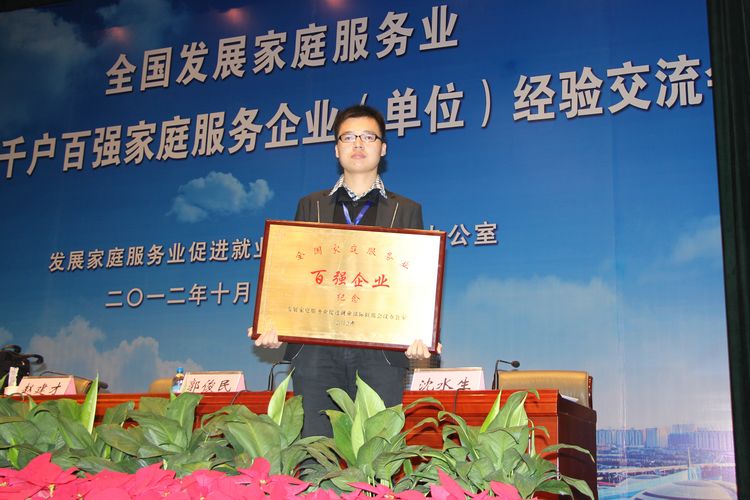 【巾幗家政訊】2012年10月16日,皖嫂家政公司獲得了《全國家庭服務業百強企業》榮譽稱號,應邀參加了在鄭州市舉辦的全國發展家庭服務業和創建千戶百強家庭服務企業(單位)經驗交流會暨頒獎典禮。皖嫂家政董事長助理程建偉同志出席頒獎大會,并接受《全國百強企業》榮譽獎牌。