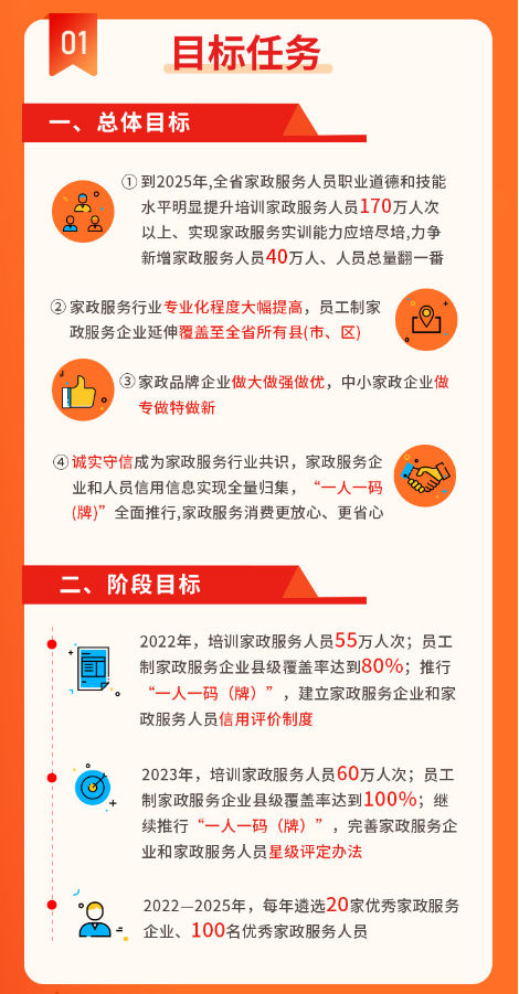 《放心家政行動方案》明確1總體目標和3個階段目標,聚焦“人員素質提升、市場主體引育、誠信體系建設、服務模式創新”四大工作舉措,解決家政服務“不滿意、不好找、不放心、不省心”的問題。