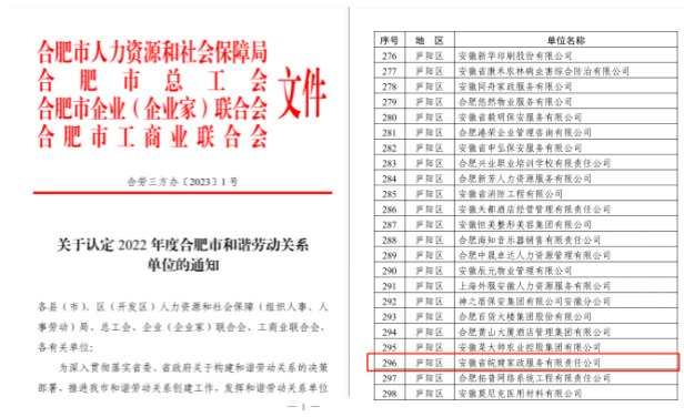 近日,合肥市人力資源和社會保障局、合肥市總工會、合肥市企業(企業家)聯合會及合肥市工商業聯合會聯合發布《關于認定2022年度合肥市和諧勞動關系單位》的通知,安徽省皖嫂家政榮獲2022年度“合肥市和諧勞動關系企業”稱號!