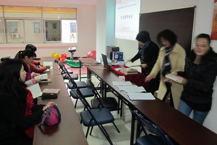 開班前中心老師在向學員發放書籍和學習用品
