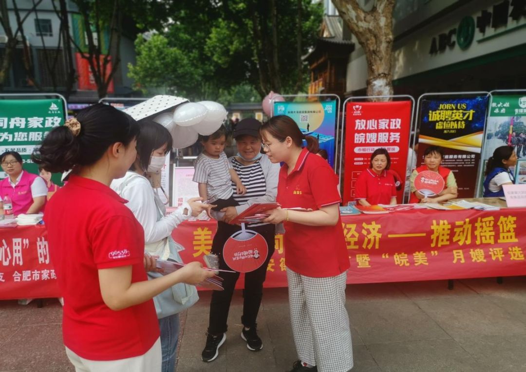 皖嫂家政工作人員在現(xiàn)場向過往群眾分發(fā)宣傳單頁,向廣大市民群眾宣傳以“美麗時尚‘她'經(jīng)濟(jì)----推動搖籃、推動世界”主題的安徽省首屆月嫂節(jié)暨“皖美”月嫂評選大賽活動內(nèi)容。