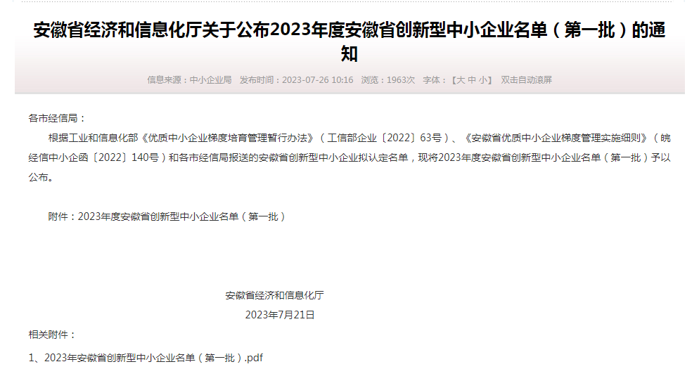 近日,省經信廳公布2023年度安徽省創新型中小企業名單,安徽省皖嫂成功入選。