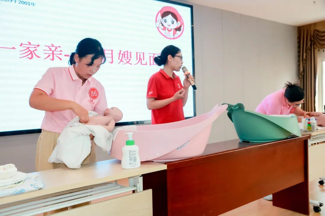 月嫂們現場演示了如何給新生兒洗澡、撫觸、沖調奶粉以及抱娃喂奶的正確姿勢等等。