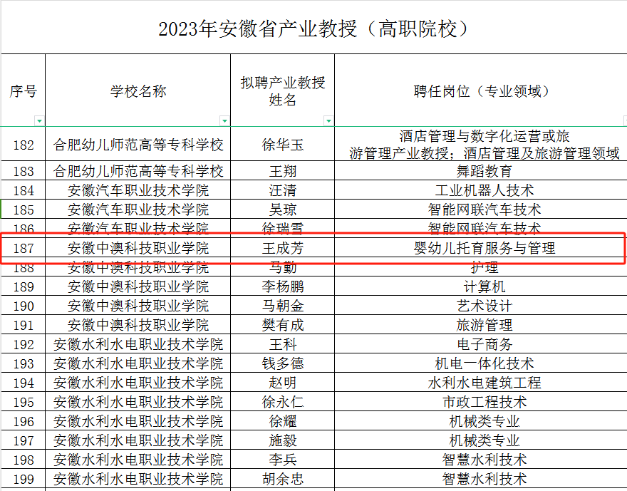 近日,安徽省教育廳、安徽省人力資源與社會保障廳公布2023年安徽省產(chǎn)業(yè)教授認(rèn)定結(jié)果,皖嫂家政總經(jīng)理王成芳成為安徽家政行業(yè)首位產(chǎn)業(yè)教授,入庫安徽中澳科技職業(yè)學(xué)院嬰幼兒托育服務(wù)與管理領(lǐng)域?qū)<?,進(jìn)一步對皖嫂家政與安徽中澳科技職業(yè)學(xué)院不斷深化推進(jìn)產(chǎn)教融合、開展校企合作成效給予大力肯定。