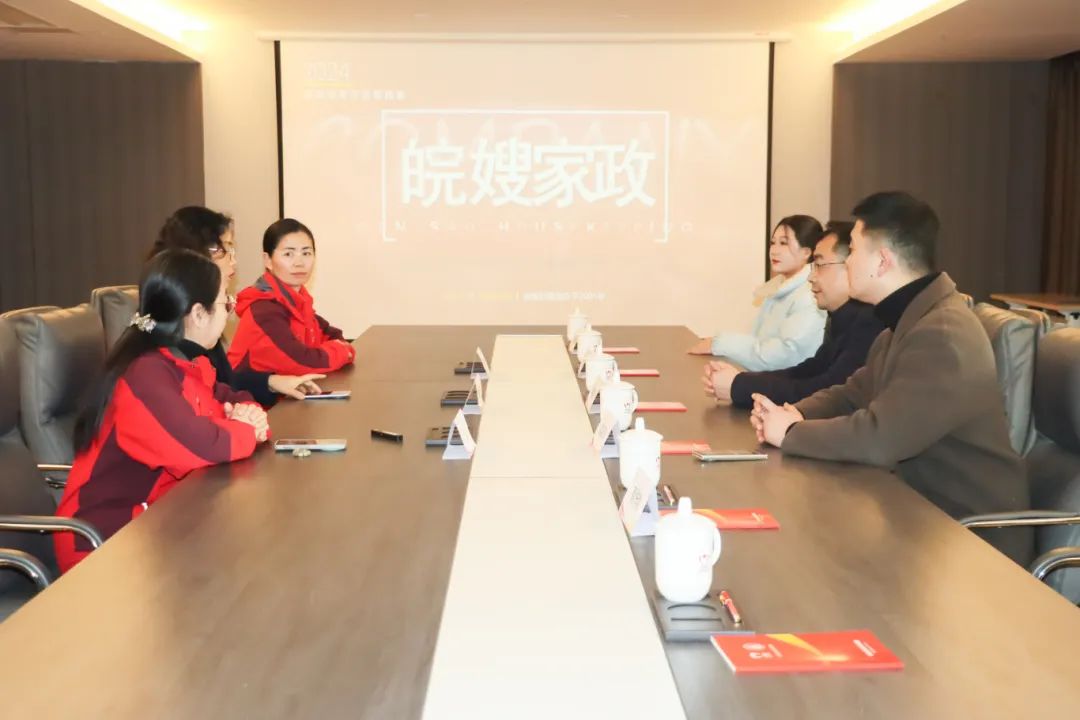 2025年1月17日,六安職業技術學院幼教學院黨總支書記胡俊杰蒞臨安徽省皖嫂家政調研,幼教學院黨總支副書記尤俊生、幼教學院托育產業學院招生就業科科長鄧羽豐、學生陶雨珊陪同,安徽省皖嫂家政總經理王成芳、副總經理王蕓接待。