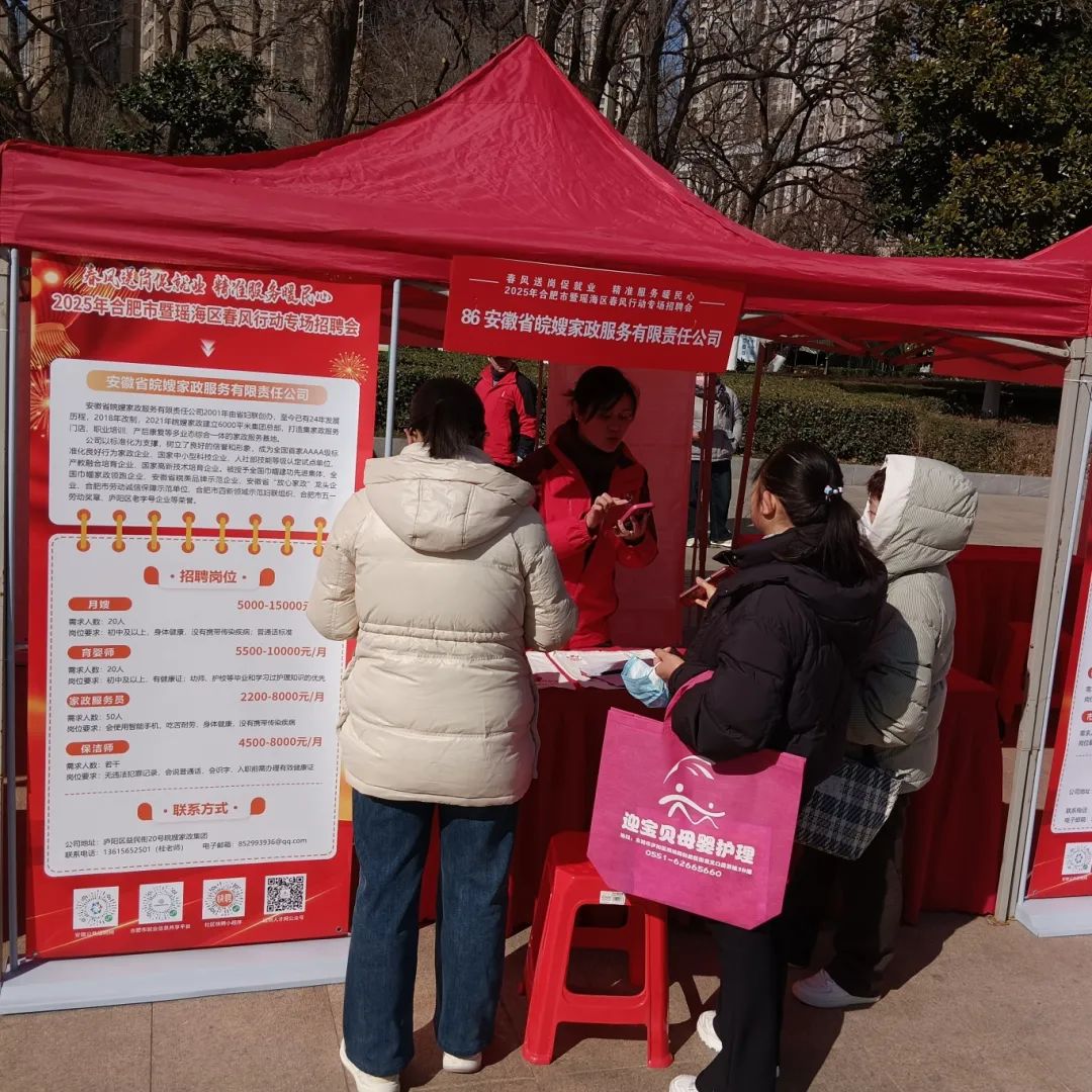2月8日上午,由省人力資源和社會保障廳指導,市人力資源和社會保障局、市總工會、市婦聯、瑤海區政府等聯合主辦的2025年合肥市暨瑤海區春風行動專場招聘會在瑤海區和平廣場舉行,安徽皖嫂家政集團參與了本次活動。