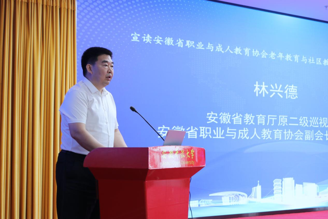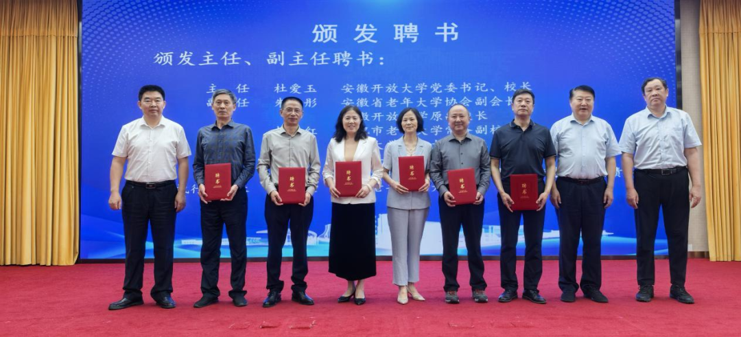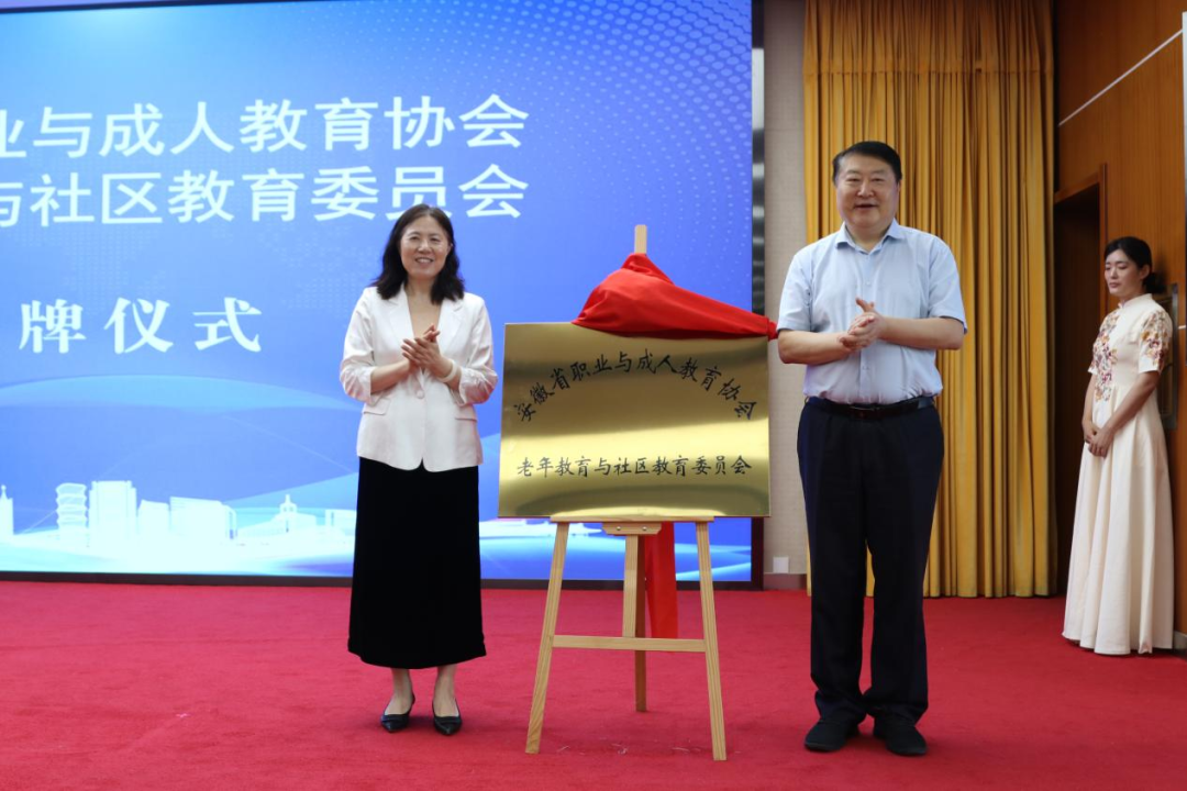 安徽省職教成教協會領導現場宣讀委員會成立批復文件,并與安徽開放大學校領導共同為“老年教育與社區教育委員會”揭牌。