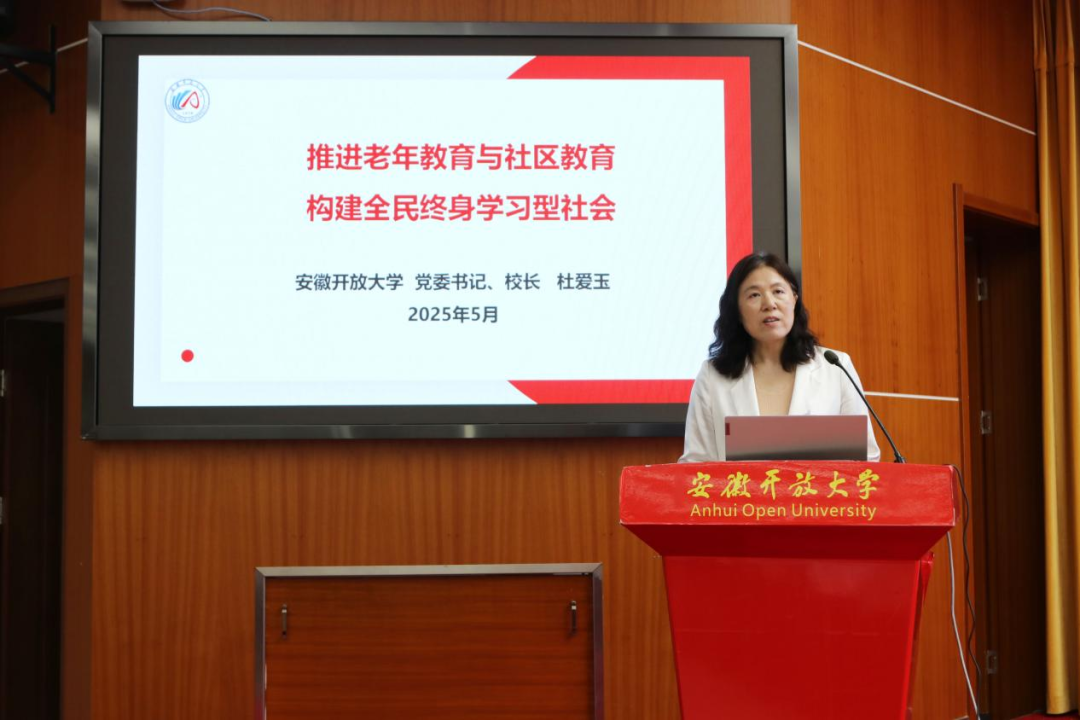 委員會主任、安徽開放大學黨委書記、校長杜愛玉以“推進老年教育與社區教育,構建全民終身學習型社會”做主題報告。