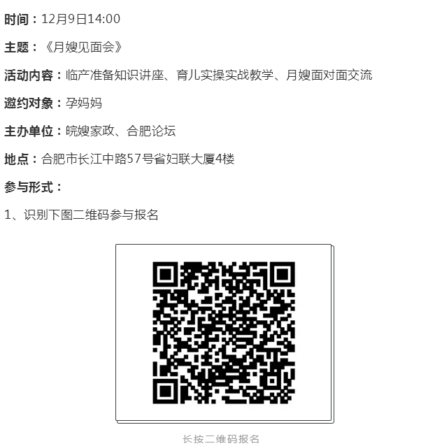 溫馨提醒:本活動的招募對象為有請月嫂意向且之前沒有預定過月嫂的家庭,若部分孕媽準爸對新生兒護理等內容感興趣,可關注合肥論壇《準爸訓練營》招募資訊!