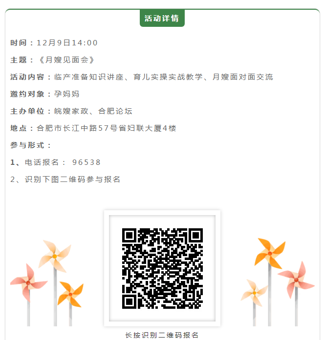 溫馨提醒:本活動的招募對象為有請月嫂意向且之前沒有預定過月嫂的家庭,若部分孕媽準爸對新生兒護理等內容感興趣,還可關注合肥論壇《準爸訓練營》招募資訊!