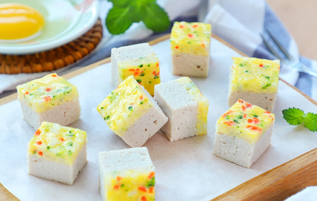 烹飪步驟:豬里脊順紋路切小塊,放入冷卻后的蔥姜水,浸泡半小時。起鍋燒水,水開后,放入甜椒、西蘭花焯水2分鐘。起鍋燒水,水開后,放入甜椒、西蘭花焯水2分鐘。甜椒皮寶寶不容易消化,媽媽們記得要去掉哦。甜椒切小丁,西蘭花去梗、切碎。這里媽媽們可以根據寶寶的咀嚼能力來確定蔬菜切的大小。雞蛋磕入碗中,打攪均勻,撇去浮沫。攪打好的蛋液中,分別倒入西蘭花碎、甜椒丁和米飯,攪拌均勻。輔食機內依次倒入豬里脊、熟鐵棍山藥,攪打均勻細膩。模具底部墊硅油紙,倒入豬肉山藥泥,鋪平表面。將攪拌好的米飯糊倒在豬肉山藥泥上面,鋪平表面。冷水入鍋,蓋上小盤子,大火蒸20分鐘。蒸好后,倒扣冷卻脫模,切成小方。