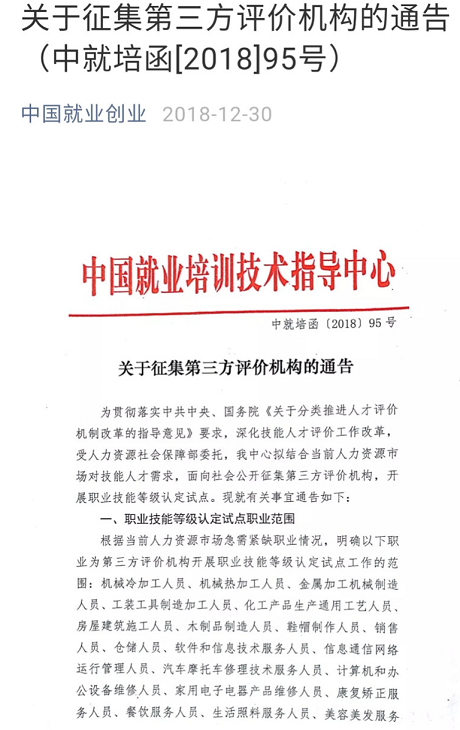 根據中共中央辦公廳、國務院辦公廳印發《關于分類推進人才評價機制改革的指導意見》文件精神,“完善職業資格評價、職業技能等級認定、專項職業能力考核等多元化評價方式,做好評價結果有機銜接”,人力資源和社會保障部職業技能鑒定中心在《關于征集第三方評價機構的通告》(中就培函〔2018〕95號)文件中提出,“家政服務員”作為國務院之前取消的職業資格許可和認定事項,被認定為“急需緊缺職業(工種)”,開展職業技能等級認定。