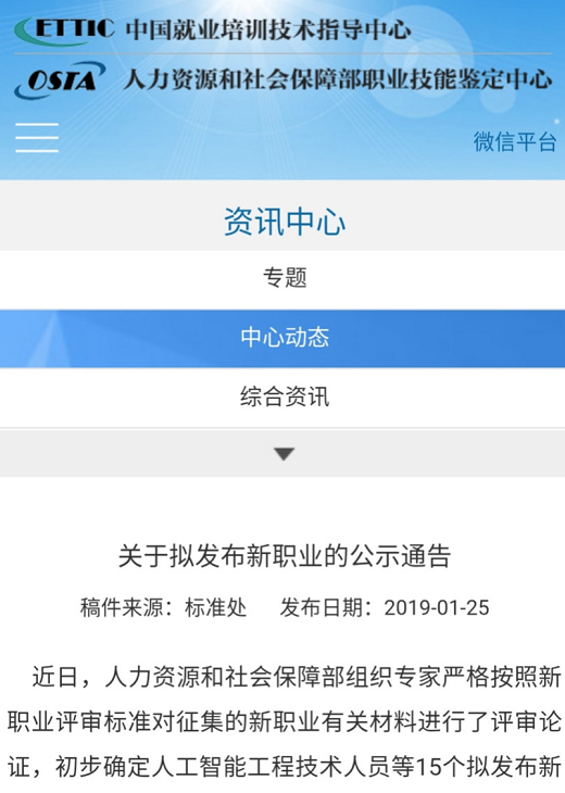 近日,人力資源和社會保障部組織專家嚴格按照新職業評審標準對征集的新職業有關材料進行了評審論證,初步確定人工智能工程技術人員等15個擬發布新職業。