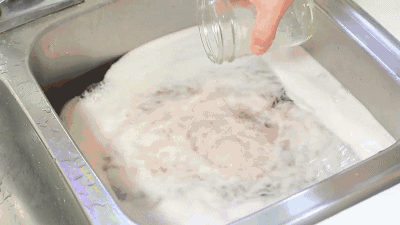 取一杯醋和半杯小蘇打,倒入堵塞的洗手池中。