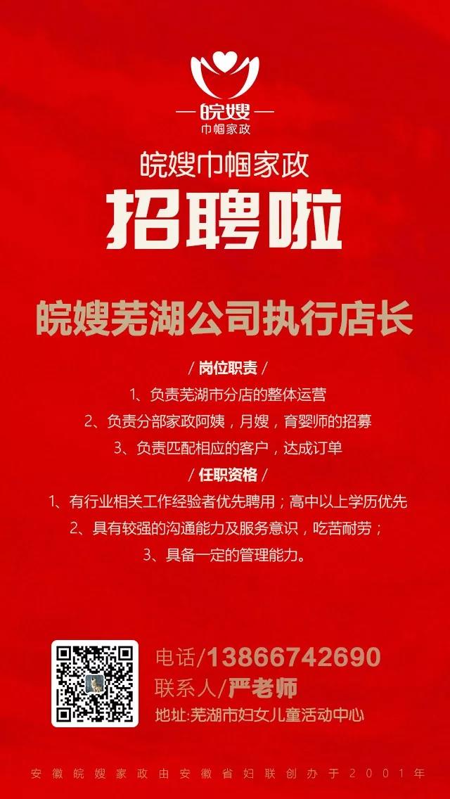安徽皖嫂巾幗家政服務中心是一家由省婦聯于2001年創辦的綜合性家政服務中心,至今已有18年發展歷程。公司主營業務涵蓋母嬰護理、家政服務、政企保潔、職業培訓等。目前,因公司直營店發展需要,誠招皖嫂蕪湖公司執行店長: