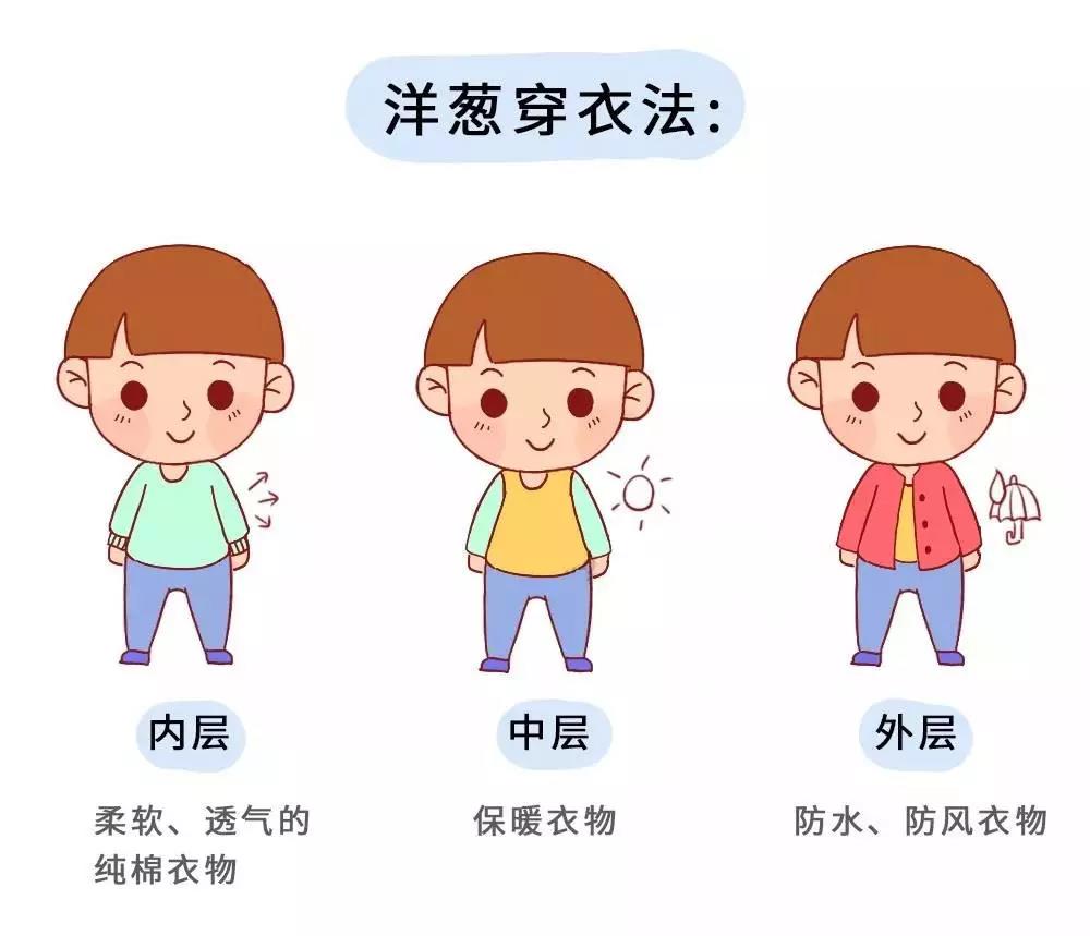 秋季早晚溫差大,為了保證孩子不著涼,好多家長給孩子采取了“洋蔥式穿衣法”,就是像洋蔥一樣一層層的穿衣服。里面的衣服選擇柔軟、透氣的棉料,外套選擇防風或防水的夾克,以應對天氣變化。晚上氣溫較涼的時候再搭配帽子、襪子等。這樣的穿衣策略相比一件厚外套更靈活舒適,可以達到保暖又不厚重的目的。