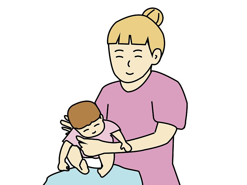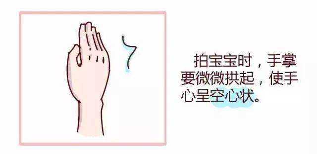 03. 用一只手穩(wěn)穩(wěn)地抱住寶寶的臀部,另一只手以空心掌(拱起手掌,呈半圓弧形)在寶寶背部連續(xù)不斷地輕拍或輕撫;
